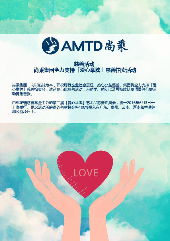 慈善活动 - 尚乘集团全力支持「爱心举牌」慈善拍卖活动 尚乘集团一向以热诚为本,积极履行企业社会责任,热心公益慈善。集团将全力支持「爱心举牌」慈善拍卖会,透过参与此慈善活动,为助学丶助幼以及可持续扶贫项目等公益活动募集善款。 由凯龙瑞慈善基金主办的第三届「爱心举牌」艺术品慈善拍卖会,将於2016年6月3日於上海举行。是次活动所筹得的善款将会将100%投入在广东丶贵州丶云南丶河南和香港等地公益项目中。 其他新闻