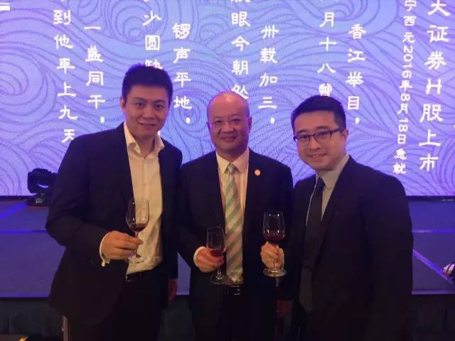 (光大证券副董事长、总裁薛峰(中)、尚乘集团董事长兼总裁蔡志坚(右)、瓴睿一带一路投资公司创始合伙人苏海德的特别代表、点融网首席技术官孔令欣(左)在光大证券上市晚宴上共同举杯庆贺)