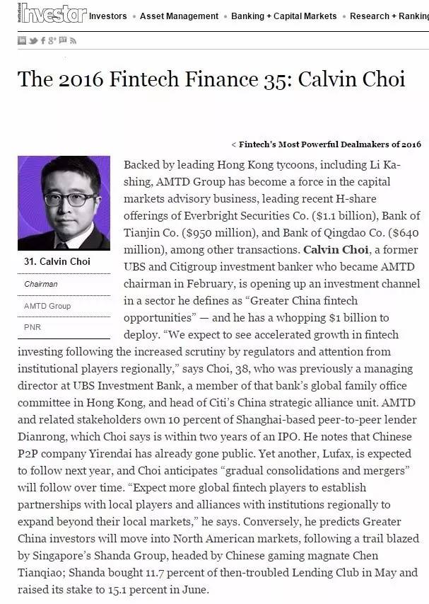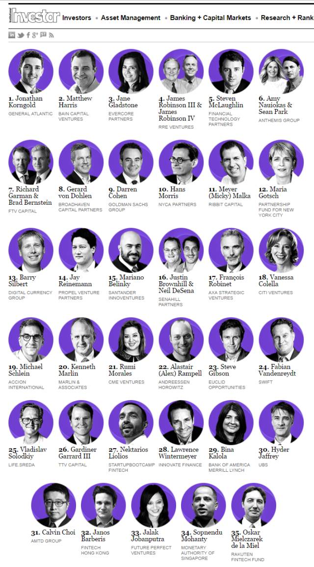 (《机构投资者》(Institutional Investor)评选出的“2016年全球金融科技投资35人” (“The 2016 Fintech Finance 35”) )