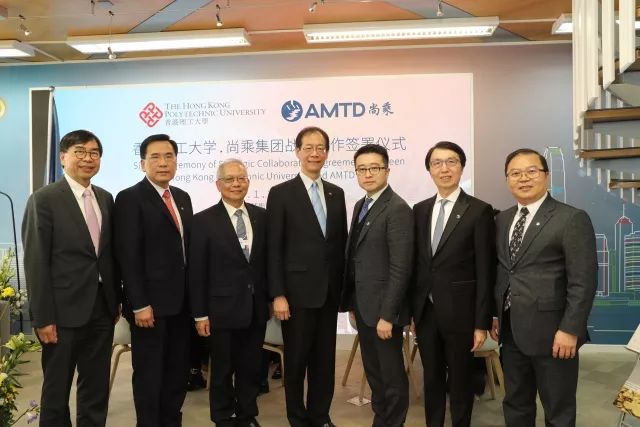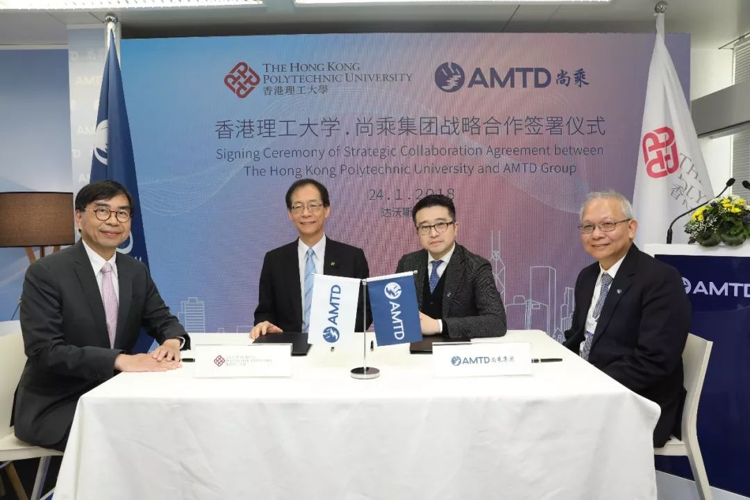 香港理工大学校长唐伟章教授、工商管理学院院长郑大昭教授首先在尚乘集团董事长兼总裁蔡志坚的陪同下,参观了达沃斯尚乘馆(AMTD Corporate Center),详细了解尚乘在金融科技领域的投入和成就。随后,双方团队针对金融科技领域的全面合作开展举行双边会议,进行充分沟通与交流,达成一系列战略合作内容,并在达沃斯尚乘馆正式签署战略合作协议。