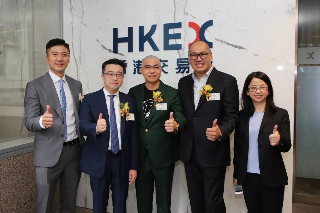 图为尚乘集团董事长兼总裁蔡志坚(左二),第七大道主席兼行政总裁孟书奇 (左三),第七大道独立非执行董事何捷 (右二),尚乘集团首席财务官邱伟文(左一)以及尚乘资本市场及咨询部主管史晓宇(右一)在上市仪式上合影