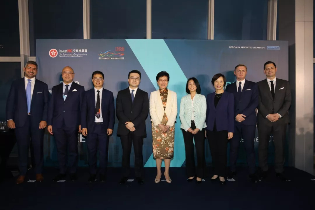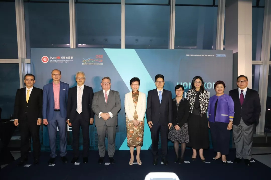 香港特区行政长官林郑月娥(左5)、投资推广署署长傅仲森(左4)、香港特别行政区政府财经事务及库务局副局长陈浩濂太平绅士(右5)、香港金融管理局副总裁李达志(左3)、创新科技署署长蔡淑娴(右4)、香港科技园公司电子、信息及通讯科技群组及智能城市科技平台总监杨天宠工程师(左2)、证券及期货事务监察委员会副行政总裁兼中介机构部执行董事梁凤仪,SBS (右3)、香港应用科技研究院行政总裁周宪本(左1)、保险业监管局执行董事(长期业务)许美莹(右2)及香港数码港公众使命总监湛家扬博士(右1)
