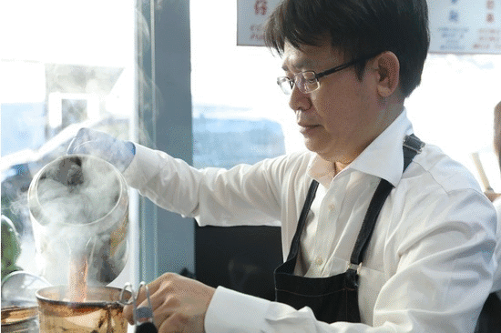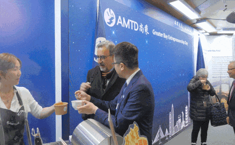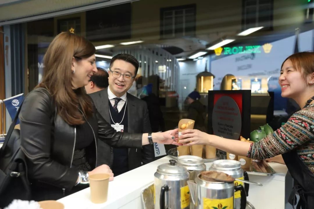 「国际金茶王」比赛冠军周师傅用最传统的冲泡方式,现场制作香港地道的香滑「丝袜奶茶」,温暖达沃斯的寒冬